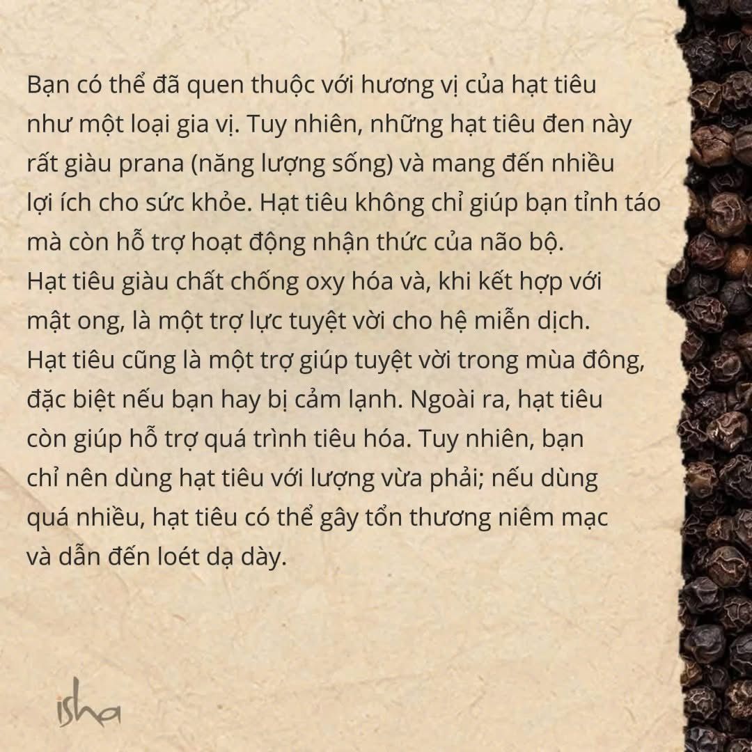 Tiêu đen không chỉ tuyệt vời để tăng thêm hương vị cho món ăn mà còn là một siêu thực phẩm yoga giàu năng lượng pranic. Tiêu đen rất tốt cho sự tỉnh táo và tiêu hóa. Hãy nhớ sử dụng với lượng vừa phải để tránh gây hại cho niêm mạc dạ dày.